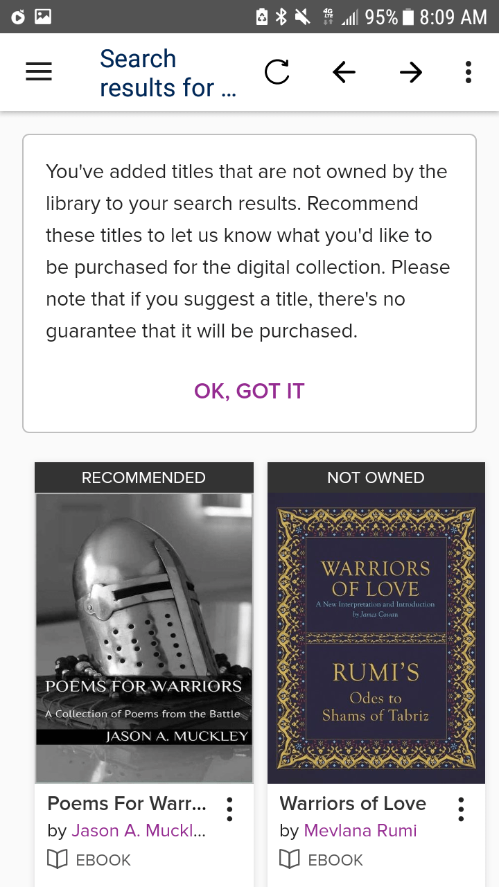 Login to your local library through the Overdrive app. Then search for “Poems For Warriors.” My title should be the first result. It probably isn’t ordered by your library but you can recommend it!