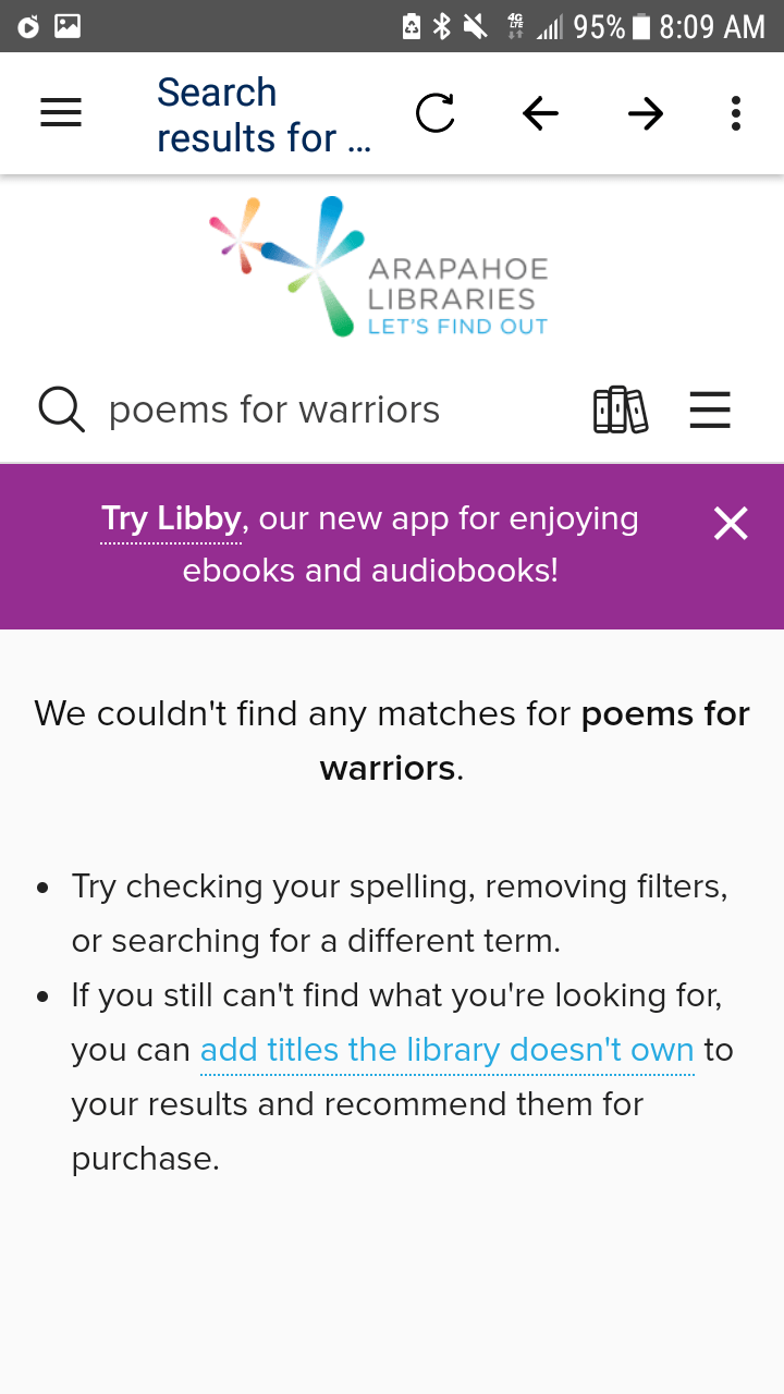[…] don’t live in Arapahoe County or anywhere near there, don’t forget that you can always request “Poems for Warriors” for your local library’s Overdrive account too. I explained this process in a previous blog […]