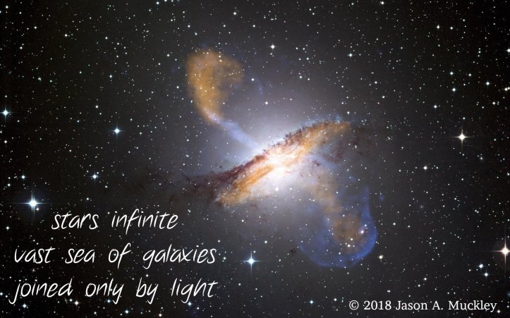 August 5, 2018 Jason A. Muckley Stars Infinite #Haiku #Poetry stars infinite vast sea of galaxies joined only by light © 2018 Jason A. Muckley Share this: Click to share on X (Opens in new window) X Click to share on Facebook (Opens in new window) Facebook Click to share on Reddit (Opens in new window) Reddit Click to share on Pinterest (Opens in new window) Pinterest Click to email a link to a friend (Opens in new window) Email More Click to share on Tumblr (Opens in new window) Tumblr Like Loading... Related