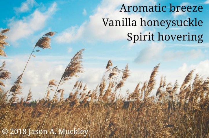 September 11, 2018September 9, 2018 Jason A. Muckley Vanilla Honeysuckle #Haiku #Poetry Aromatic breeze Vanilla Honeysuckle Spirit hovering © 2018 Jason A. Muckley Share this: Click to share on X (Opens in new window) X Click to share on Facebook (Opens in new window) Facebook Click to share on Reddit (Opens in new window) Reddit Click to share on Pinterest (Opens in new window) Pinterest Click to email a link to a friend (Opens in new window) Email More Click to share on Tumblr (Opens in new window) Tumblr Like Loading... Related