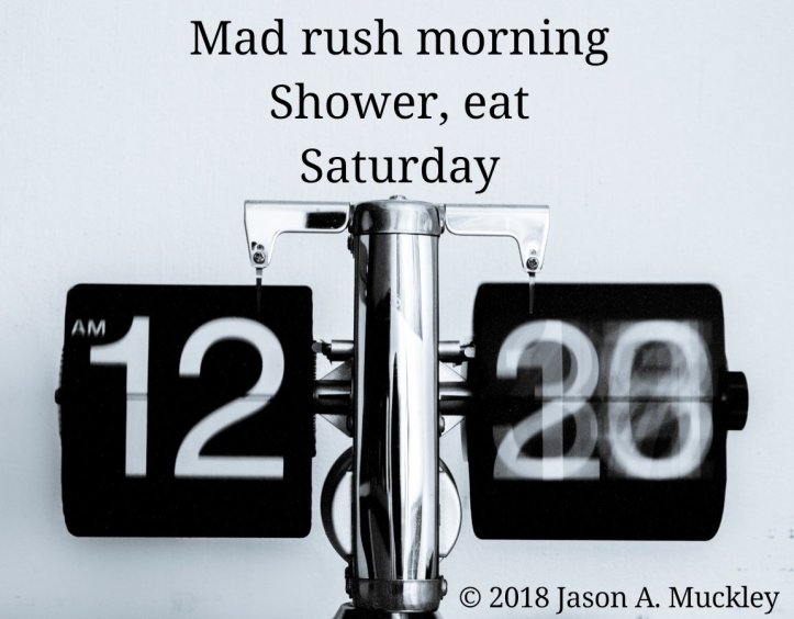 September 22, 2018September 16, 2018 Jason A. Muckley Mad Rush #Poetry #SixWordStory #Hay(na)ku Mad rush morningShower, eatSaturday © 2018 Jason A. Muckley Share this: Click to share on X (Opens in new window) X Click to share on Facebook (Opens in new window) Facebook Click to share on Reddit (Opens in new window) Reddit Click to share on Pinterest (Opens in new window) Pinterest Click to email a link to a friend (Opens in new window) Email More Click to share on Tumblr (Opens in new window) Tumblr Like Loading... Related