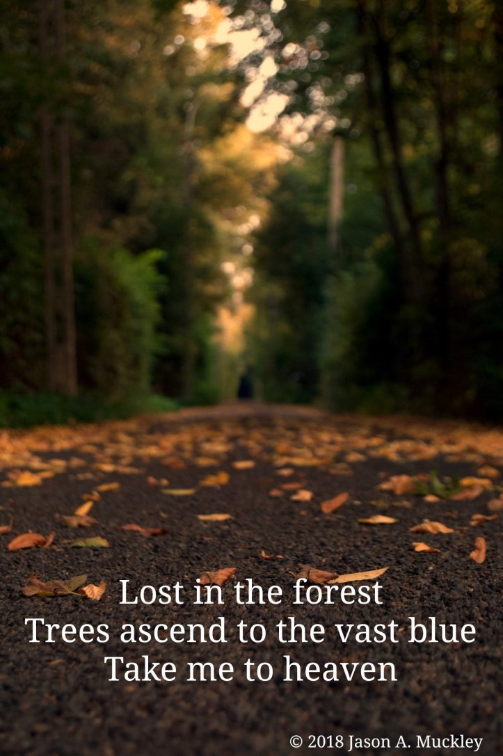 October 15, 2018 Jason A. Muckley Trees Ascend #Haiku #Poetry Lost in the forest Share this: Click to share on X (Opens in new window) X Click to share on Facebook (Opens in new window) Facebook Click to share on Reddit (Opens in new window) Reddit Click to share on Pinterest (Opens in new window) Pinterest Click to email a link to a friend (Opens in new window) Email More Click to share on Tumblr (Opens in new window) Tumblr Like Loading... Related