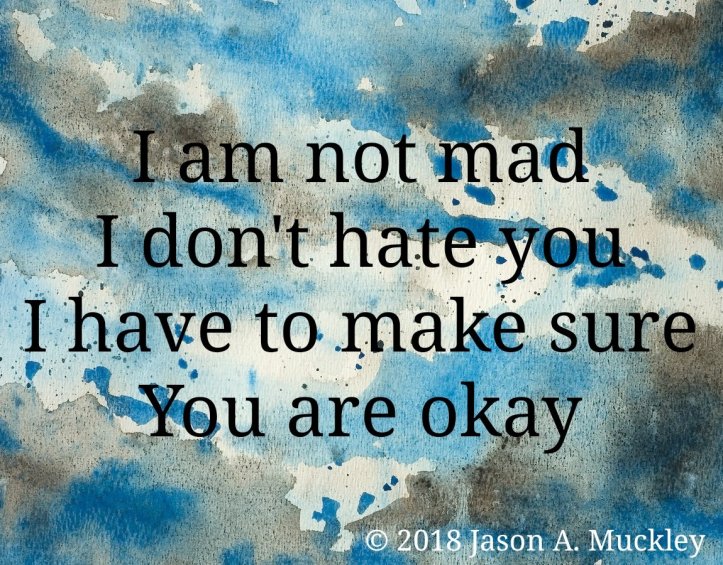 October 18, 2018October 18, 2018 Jason A. Muckley Okay #Poetry #OctPoWriMo I am not madI don’t hate youI have to make sureYou are okay © 2018 Jason A. Muckley Share this: Click to share on X (Opens in new window) X Click to share on Facebook (Opens in new window) Facebook Click to share on Reddit (Opens in new window) Reddit Click to share on Pinterest (Opens in new window) Pinterest Click to email a link to a friend (Opens in new window) Email More Click to share on Tumblr (Opens in new window) Tumblr Like Loading... Related