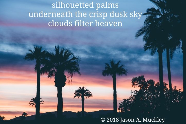 October 24, 2018October 23, 2018 Jason A. Muckley Silhouetted Palms #Haiku #Poetry Silhouetted palmsUnderneath the crisp dusk skyClouds filter heaven © 2018 Jason A. Muckley Share this: Click to share on X (Opens in new window) X Click to share on Facebook (Opens in new window) Facebook Click to share on Reddit (Opens in new window) Reddit Click to share on Pinterest (Opens in new window) Pinterest Click to email a link to a friend (Opens in new window) Email More Click to share on Tumblr (Opens in new window) Tumblr Like Loading... Related