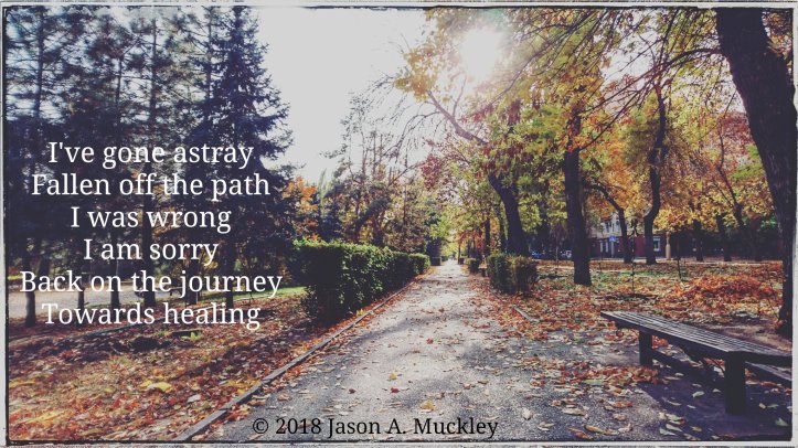 October 25, 2018October 25, 2018 Jason A. Muckley Towards Healing #Poetry I’ve gone astrayFallen off the pathI was wrongI am sorryBack on a journeyTowards healing © 2018 Jason A. Muckley Share this: Click to share on X (Opens in new window) X Click to share on Facebook (Opens in new window) Facebook Click to share on Reddit (Opens in new window) Reddit Click to share on Pinterest (Opens in new window) Pinterest Click to email a link to a friend (Opens in new window) Email More Click to share on Tumblr (Opens in new window) Tumblr Like Loading... Related