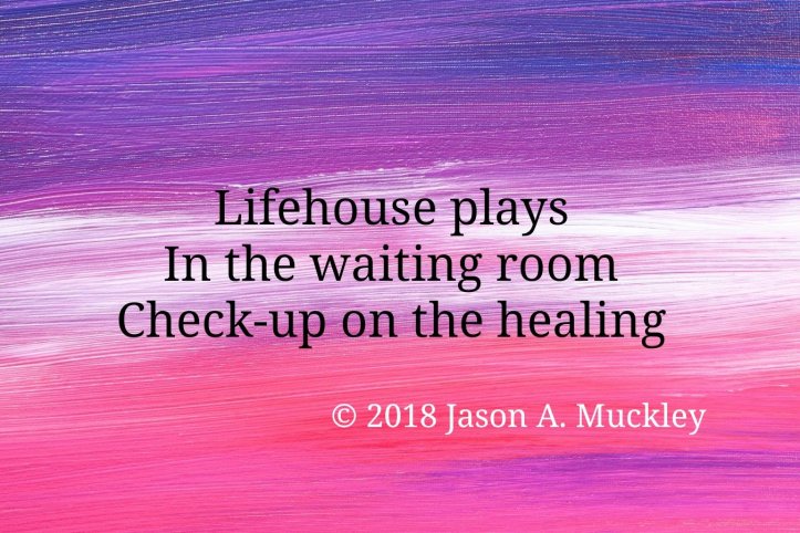 November 30, 2018November 30, 2018 Jason A. Muckley Lifehouse Plays #TenWordStory #Poetry Lifehouse plays In the waiting room Check-up on the healing © 2018 Jason A. Muckley Share this: Click to share on X (Opens in new window) X Click to share on Facebook (Opens in new window) Facebook Click to share on Reddit (Opens in new window) Reddit Click to share on Pinterest (Opens in new window) Pinterest Click to email a link to a friend (Opens in new window) Email More Click to share on Tumblr (Opens in new window) Tumblr Like Loading... Related