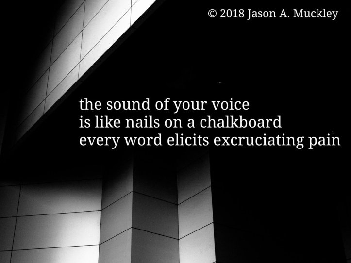 December 20, 2018 Jason A. Muckley Nails on a Chalkboard #Poetry the sound of your voice is like nails on a chalkboard every word elicits excruciating pain © 2018 Jason A. Muckley Share this: Click to share on X (Opens in new window) X Click to share on Facebook (Opens in new window) Facebook Click to share on Reddit (Opens in new window) Reddit Click to share on Pinterest (Opens in new window) Pinterest Click to email a link to a friend (Opens in new window) Email More Click to share on Tumblr (Opens in new window) Tumblr Like Loading... Related