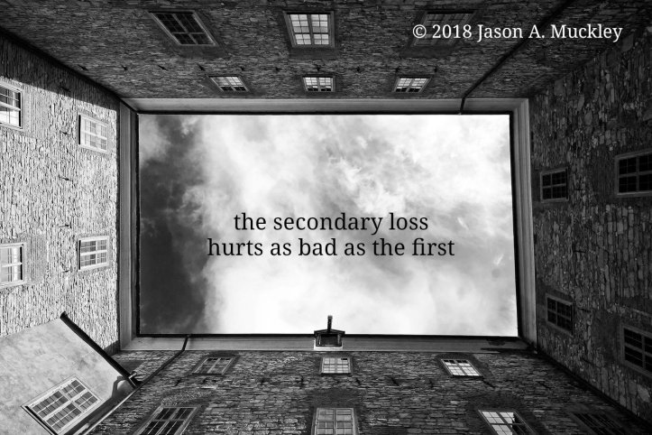 December 29, 2018 Jason A. Muckley Secondary Loss #Poetry The secondary lossHurts as bad as the first © 2018 Jason A. Muckley Share this: Share on X (Opens in new window) X Share on Facebook (Opens in new window) Facebook Share on Reddit (Opens in new window) Reddit Share on Pinterest (Opens in new window) Pinterest Email a link to a friend (Opens in new window) Email More Share on Tumblr (Opens in new window) Tumblr Like Loading... Related