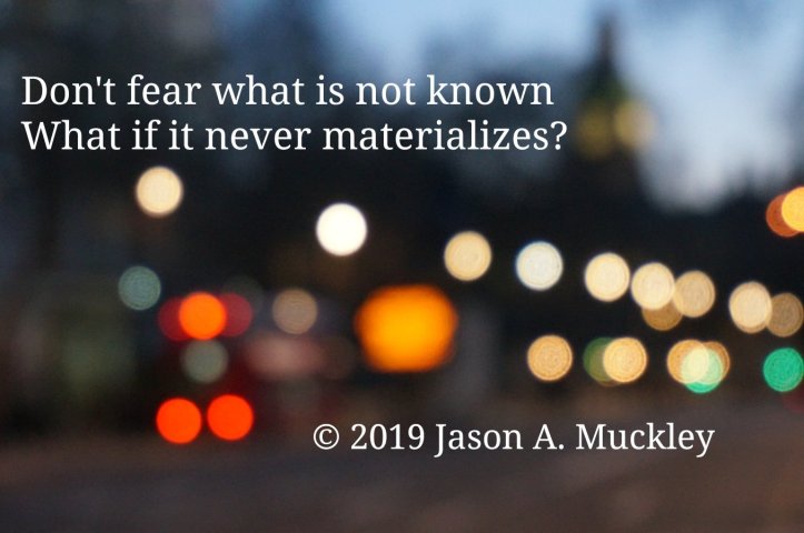 January 19, 2019 Jason A. Muckley Fear of the Unknown #Poetry Don’t fear what is not known What if it never materializes? © 2019 Jason A. Muckley Share this: Share on X (Opens in new window) X Share on Facebook (Opens in new window) Facebook Share on Reddit (Opens in new window) Reddit Share on Pinterest (Opens in new window) Pinterest Email a link to a friend (Opens in new window) Email More Share on Tumblr (Opens in new window) Tumblr Like Loading... Related
