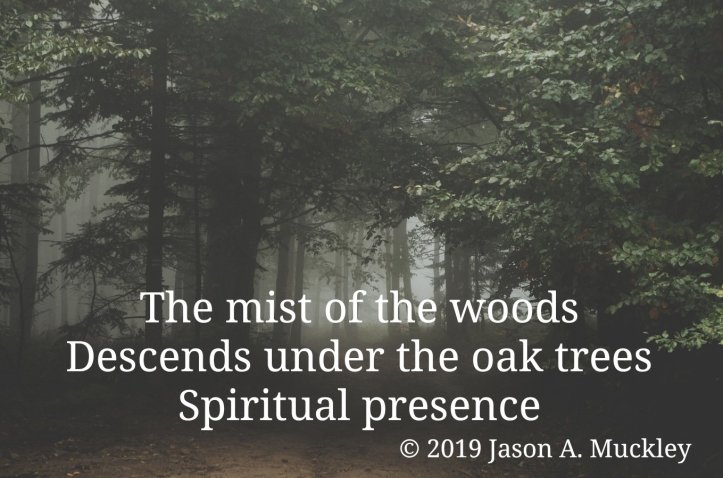 January 28, 2019 Jason A. Muckley Mist of the Woods #Poetry The mist of the woods Descends under the oak trees Spiritual presence © 2019 Jason A. Muckley Share this: Share on X (Opens in new window) X Share on Facebook (Opens in new window) Facebook Share on Reddit (Opens in new window) Reddit Share on Pinterest (Opens in new window) Pinterest Email a link to a friend (Opens in new window) Email More Share on Tumblr (Opens in new window) Tumblr Like Loading... Related