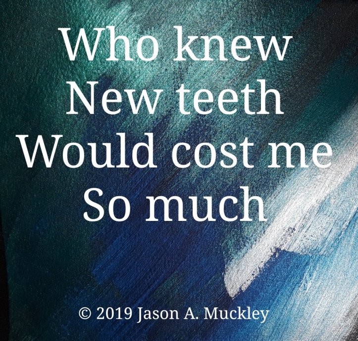 May 14, 2019 Jason A. Muckley Reflection #Poetry Who knew New teeth Would cost me So much © 2019 Jason A. Muckley Share this: Click to share on X (Opens in new window) X Click to share on Facebook (Opens in new window) Facebook Click to share on Reddit (Opens in new window) Reddit Click to share on Pinterest (Opens in new window) Pinterest Click to email a link to a friend (Opens in new window) Email More Click to share on Tumblr (Opens in new window) Tumblr Like Loading... Related