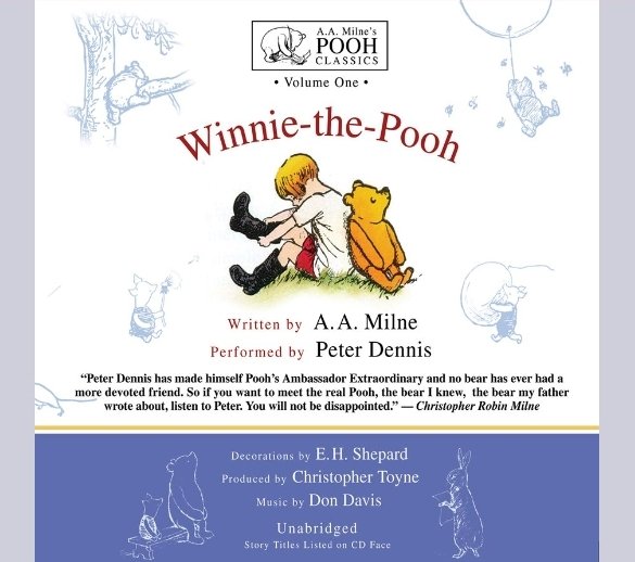 The audiobook performed by Peter Dennis with sound effects and an animated voice draws the listeners into the adventures of the Hundred Acre Wood with Christopher Robin, Pooh Bear, Piglet, Rabbit, Tigger and the rest of the gang.
