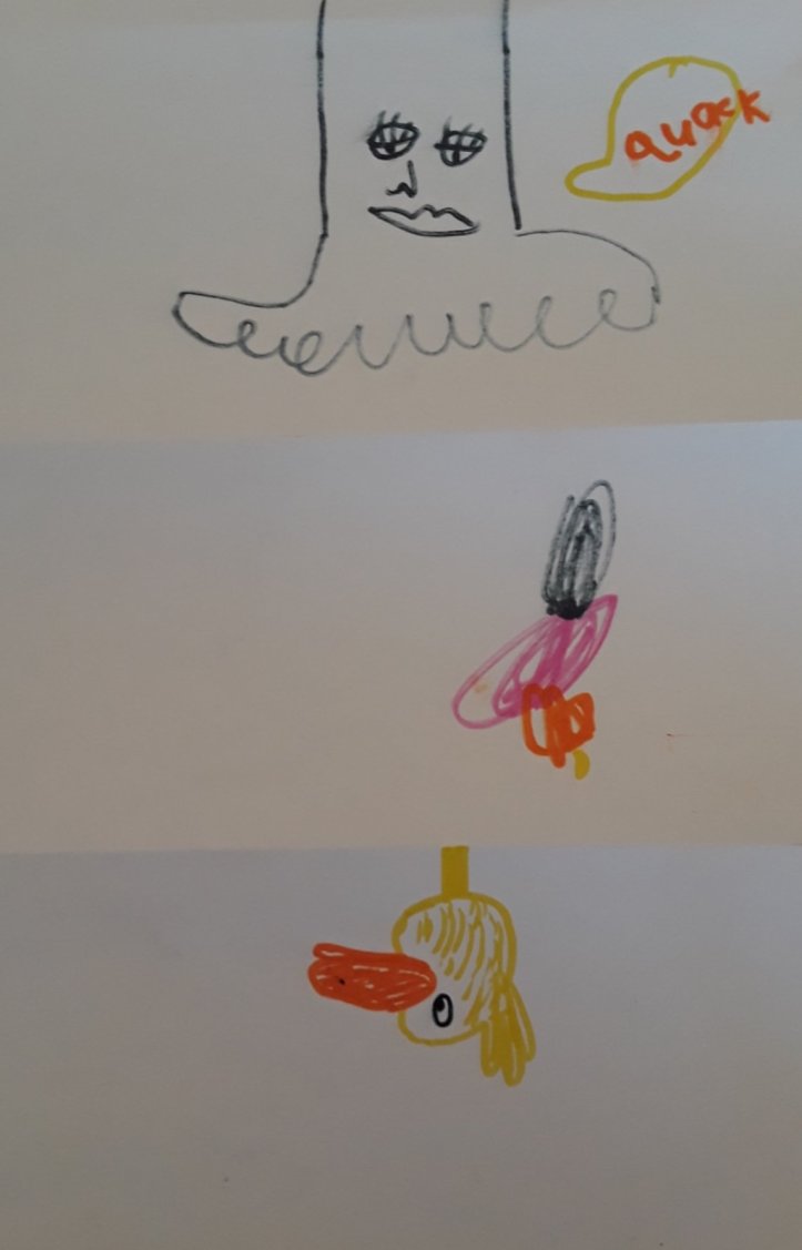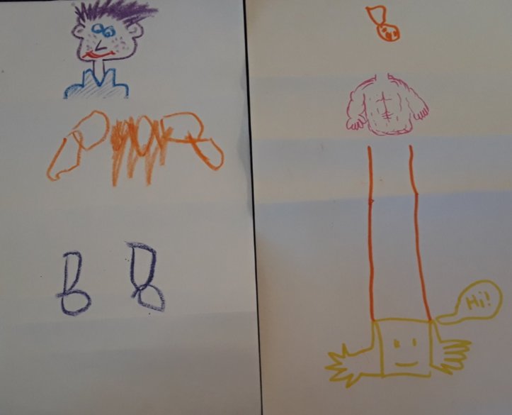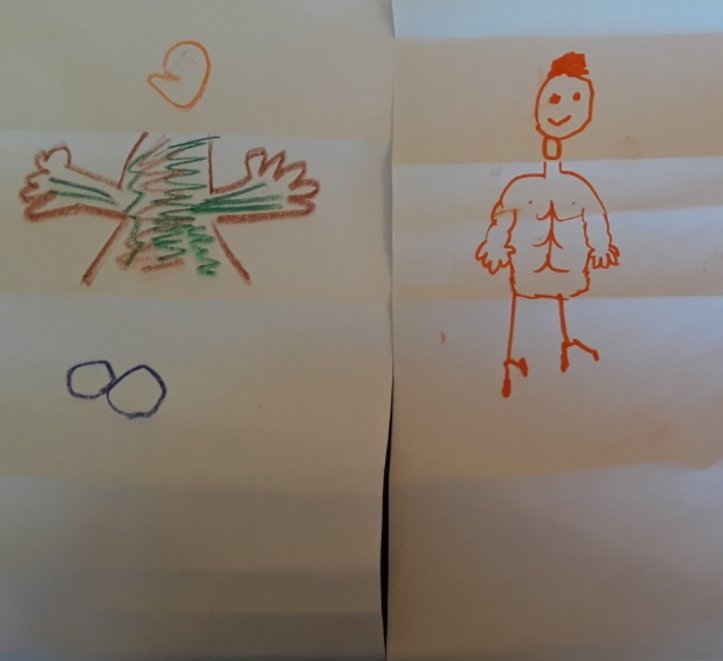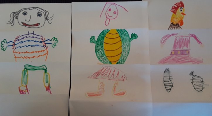 I created these beautiful works of art with my kids with scrap paper and markers. The method used was to start with folding up the first third of the page for the head, then you fold the part you just colored so that the next person can’t see what you drew. The next person draws the torso/midsection, folds up their drawing and passes it to the last person, who draws the feet.
