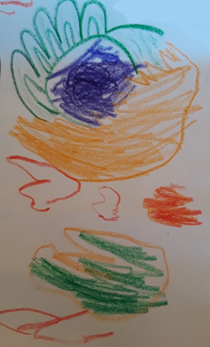 Another project to try is a “scribble” drawing. You or your child scribbles something on the paper and passes it to the next person who adds new scribbles and colors to turn the picture into something new. It could be an abstract drawing or an absurdist drawing like putting five ears on a “ball-like” creature.