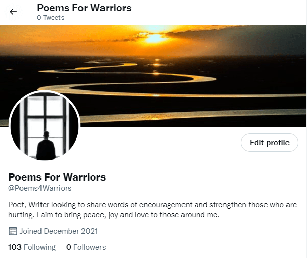 Hey Writer Friends (and Reader Friends)! I just wanted to let you know that I have a new Twitter handle: @Poems4Warriors!