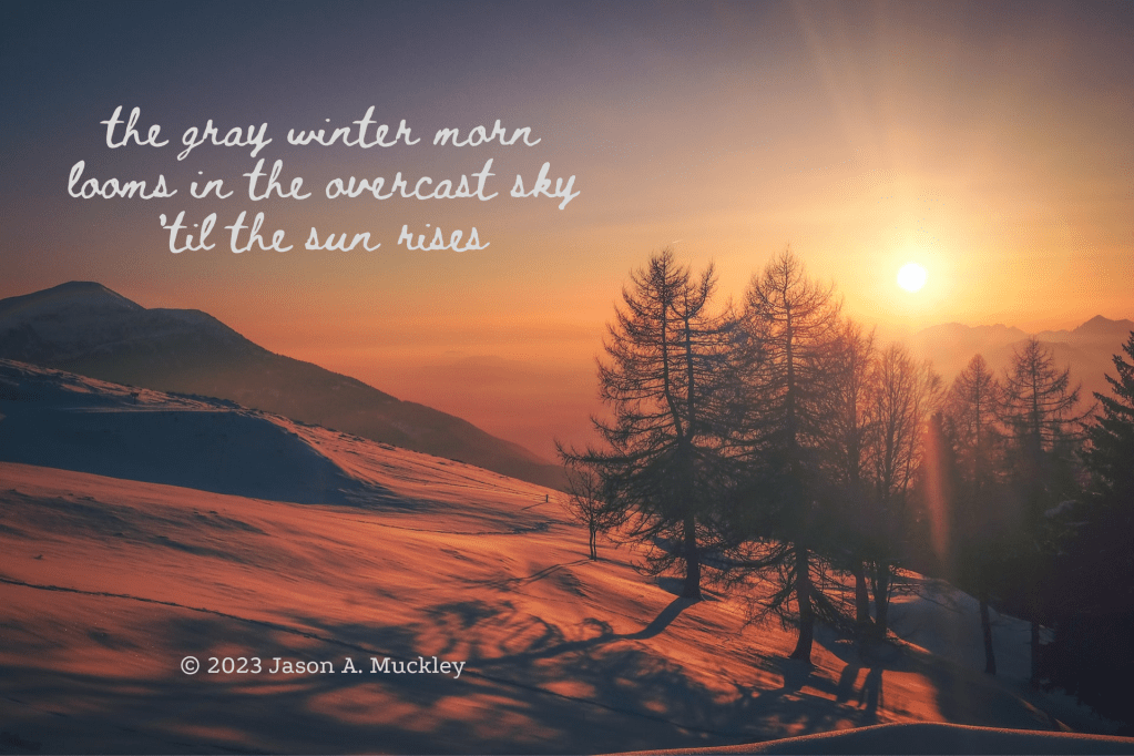 February 18, 2023February 17, 2023 Jason A. Muckley Change #Haiku #Nature #Poetry Photo by Cristina Gottardi on Unsplash the gray winter mornlooms in the overcast sky’til the sun rises © 2023 Jason A. Muckley Share this: Click to share on X (Opens in new window) X Click to share on Facebook (Opens in new window) Facebook Click to share on Reddit (Opens in new window) Reddit Click to share on Pinterest (Opens in new window) Pinterest Click to email a link to a friend (Opens in new window) Email More Click to share on Tumblr (Opens in new window) Tumblr Like Loading... Related