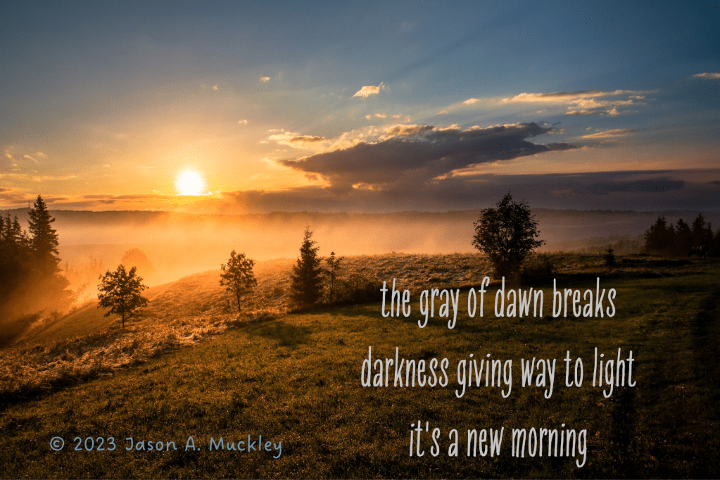 March 12, 2023March 12, 2023 Jason A. Muckley Morning #Haiku #Poetry #Journey Photo by Dawid Zawila on Unsplash the gray of dawn breaksdarkness giving way to lightit’s a new morning © 2023 Jason A. Muckley Share this: Click to share on X (Opens in new window) X Click to share on Facebook (Opens in new window) Facebook Click to share on Reddit (Opens in new window) Reddit Click to share on Pinterest (Opens in new window) Pinterest Click to email a link to a friend (Opens in new window) Email More Click to share on Tumblr (Opens in new window) Tumblr Like Loading... Related